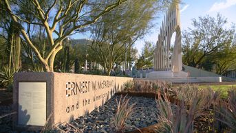 Symbolism is used throughout the site to represent Mac’s professional accomplishments and personal hardships. Extensive research for the panels at the memorial depicting the chapters in his life was provided by historian Vincent Murray of Phoenix.
